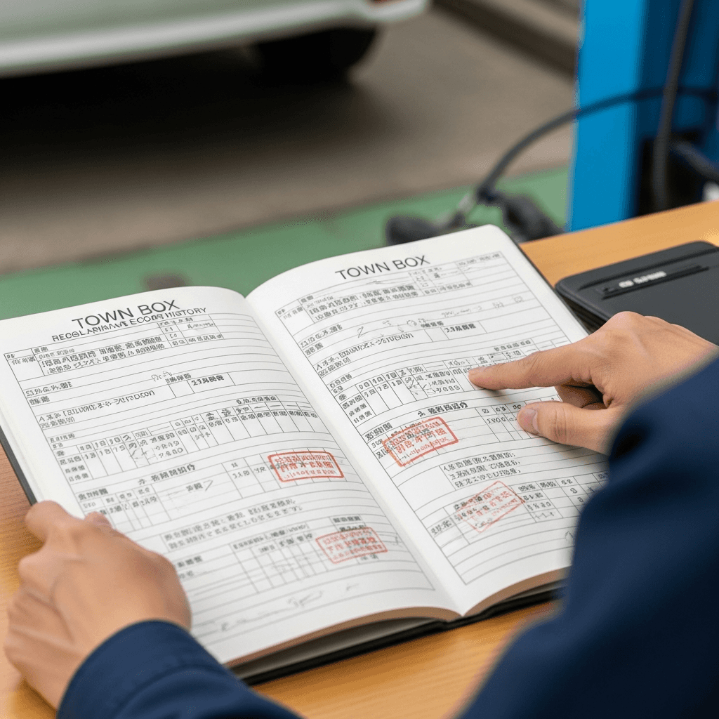 タウンボックスの整備記録簿に定期点検(12ヶ月・24ヶ月)の履歴が全て記載されていれば「管理の行き届いた車」と高評価。特にエンジンオイル交換履歴は重要で+6~9万円の効果。