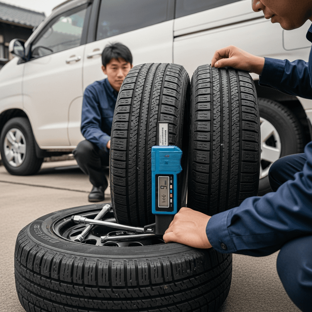 商用車はタイヤが消耗品。4本新品(または溝8mm以上)+スペアタイヤ完備なら「すぐ業務使用可能」で+4~7万円UP。特にタウンエースバンは配送業需要が高く効果大。