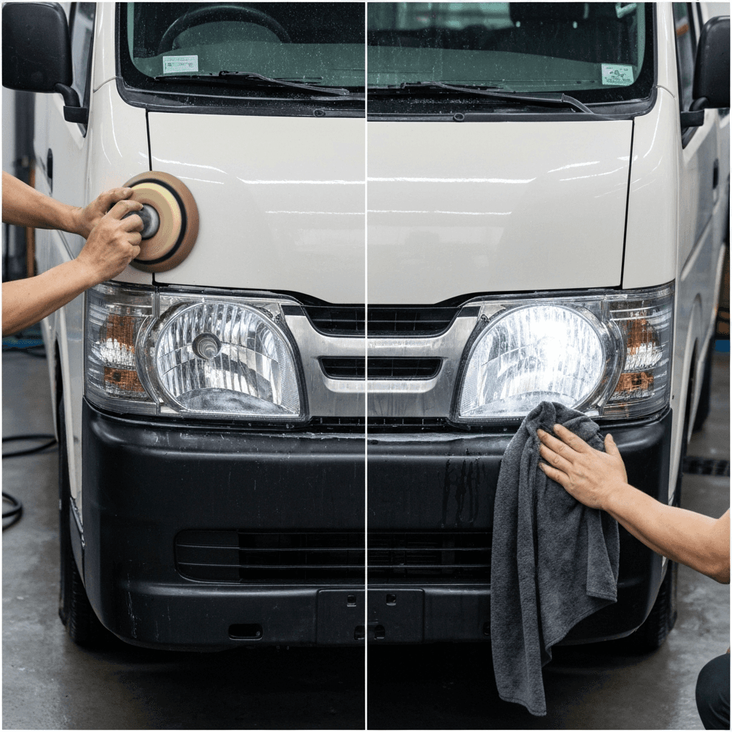トヨエースはヘッドライトの黄ばみとボディの鉄粉が第一印象を損ねます。研磨+鉄粉除去クリーナー+ワックスで輝きを取り戻せば「程度良好」と判断され+4~7万円の効果。