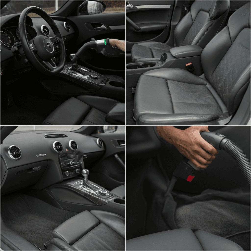TT RSクーペは第一印象が査定の8割を決めます。シート隙間のゴミ除去、マット洗浄、樹脂パーツ艶出しで新車級の清潔感に。特に臭いゼロなら「禁煙車」扱いで+5~8万円UP。