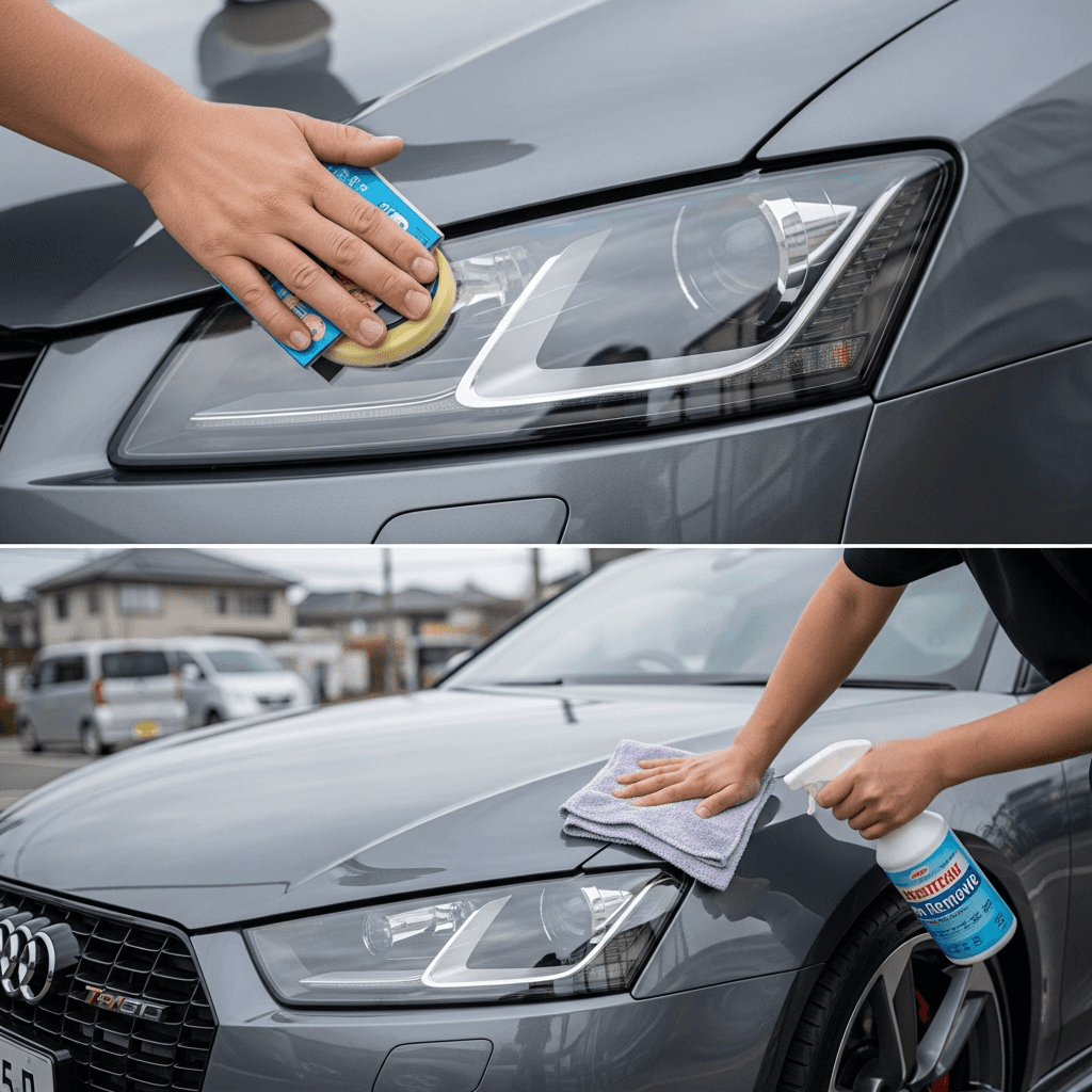 TT RSクーペはヘッドライトの黄ばみとボディの鉄粉が第一印象を損ねます。研磨+鉄粉除去クリーナー+ワックスで輝きを取り戻せば「程度良好」と判断され+4~7万円の効果。