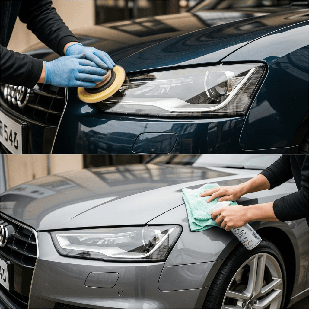 TTSクーペはヘッドライトの黄ばみとボディの鉄粉が第一印象を損ねます。研磨+鉄粉除去クリーナー+ワックスで輝きを取り戻せば「程度良好」と判断され+4~7万円の効果。
