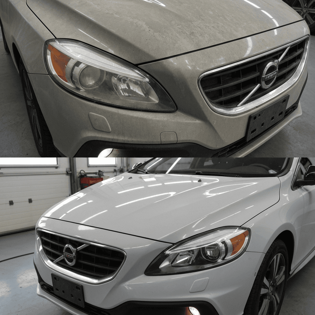 V40クロスカントリーはヘッドライトの黄ばみとボディの鉄粉が第一印象を損ねます。研磨+鉄粉除去クリーナー+ワックスで輝きを取り戻せば「程度良好」と判断され+4~7万円の効果。