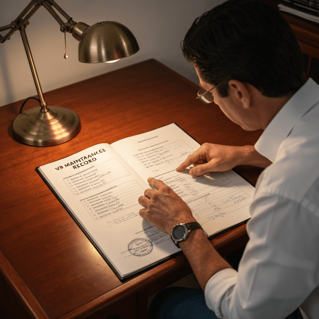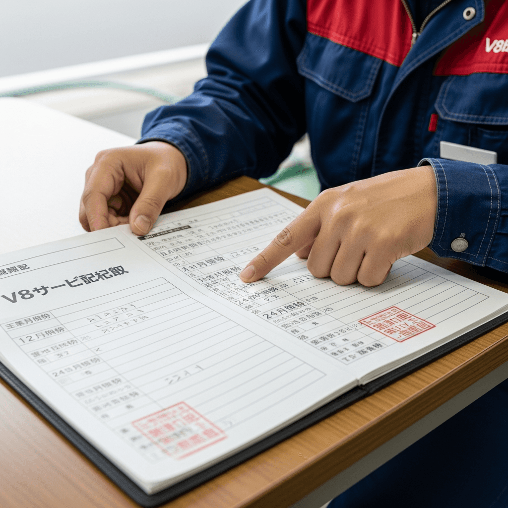 V8の整備記録簿に定期点検(12ヶ月・24ヶ月)の履歴が全て記載されていれば「管理の行き届いた車」と高評価。特にエンジンオイル交換履歴は重要で+6~9万円の効果。