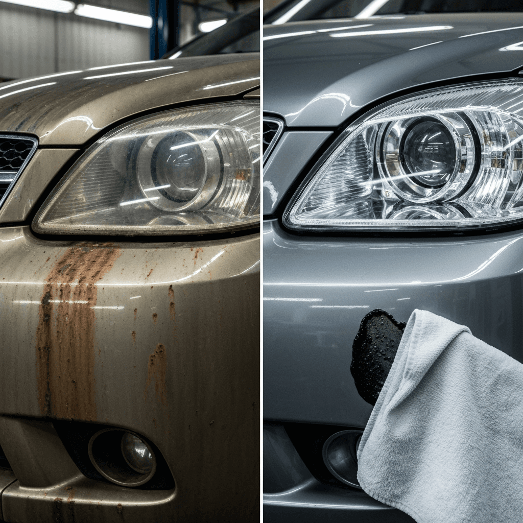 V8はヘッドライトの黄ばみとボディの鉄粉が第一印象を損ねます。研磨+鉄粉除去クリーナー+ワックスで輝きを取り戻せば「程度良好」と判断され+4~7万円の効果。