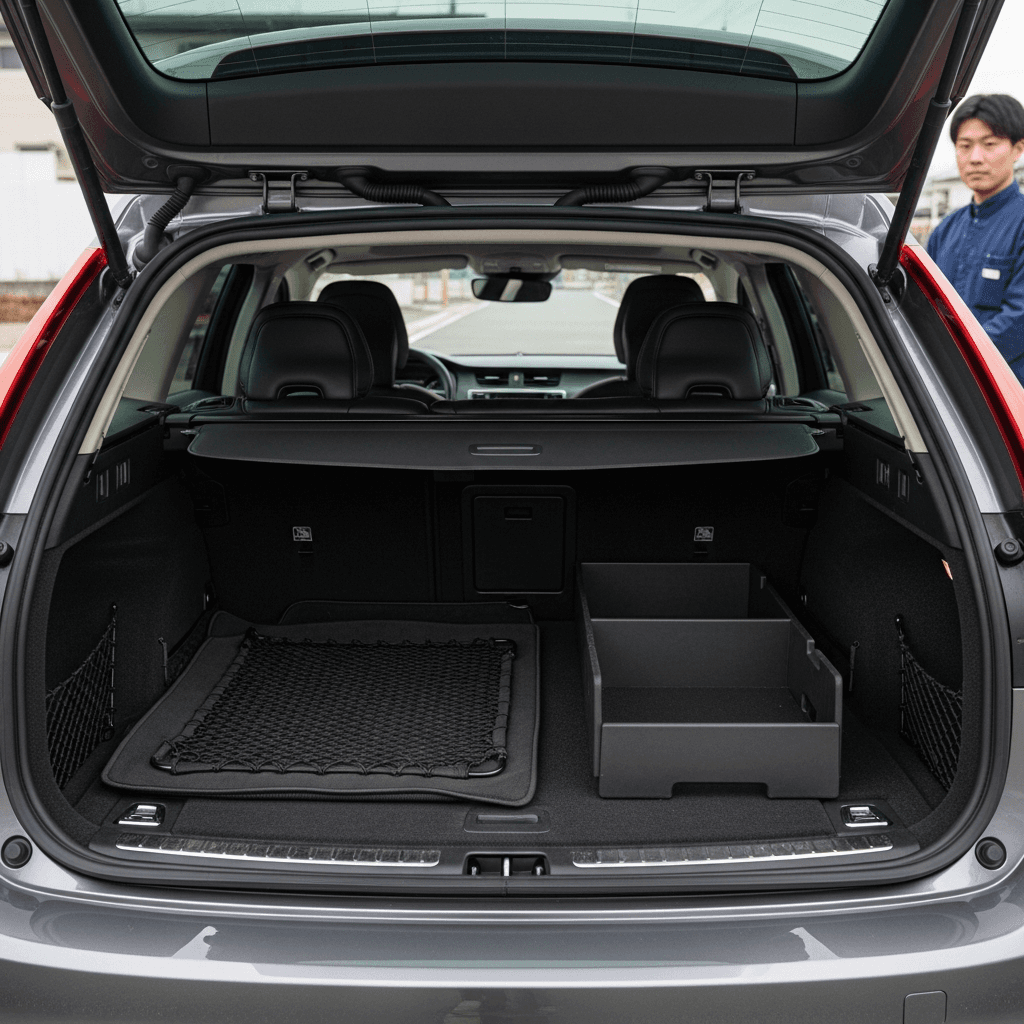 V90のようなワゴンは荷室の実用性が価値の源泉。荷室保護マット+純正ラゲッジネット+仕切り板が揃っていれば「荷室ダメージなし」で+5~8万円の評価UP。
