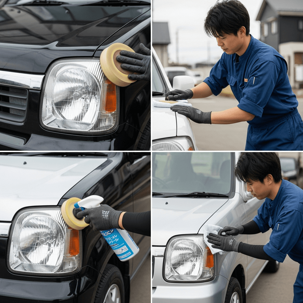バモスホビオはヘッドライトの黄ばみとボディの鉄粉が第一印象を損ねます。研磨+鉄粉除去クリーナー+ワックスで輝きを取り戻せば「程度良好」と判断され+4~7万円の効果。