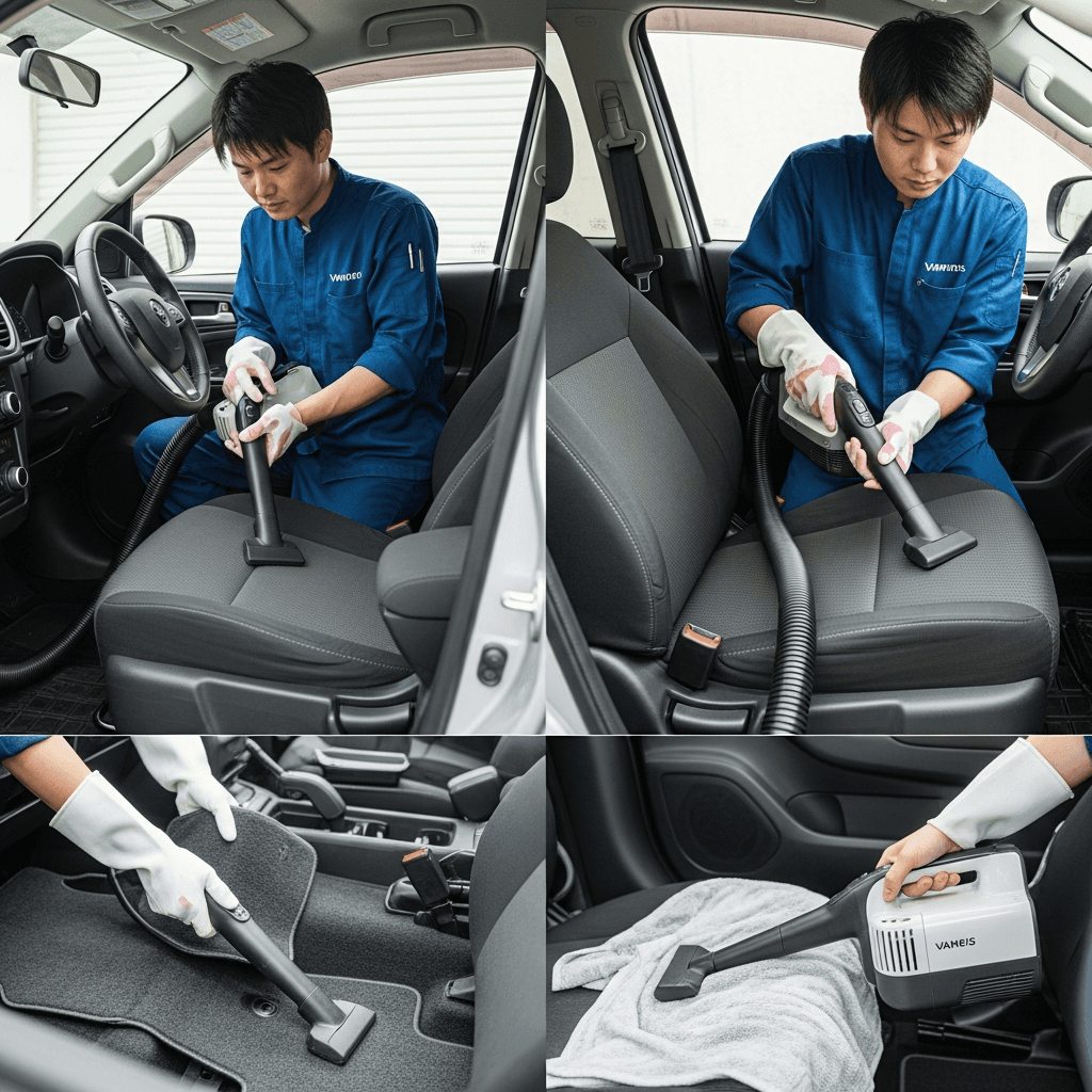 バモスホビオは第一印象が査定の8割を決めます。シート隙間のゴミ除去、マット洗浄、樹脂パーツ艶出しで新車級の清潔感に。特に臭いゼロなら「禁煙車」扱いで+5~8万円UP。