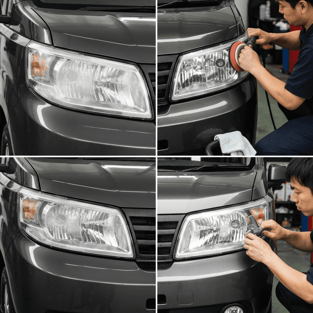 バモスホビオバンはヘッドライトの黄ばみとボディの鉄粉が第一印象を損ねます。研磨+鉄粉除去クリーナー+ワックスで輝きを取り戻せば「程度良好」と判断され+4~7万円の効果。