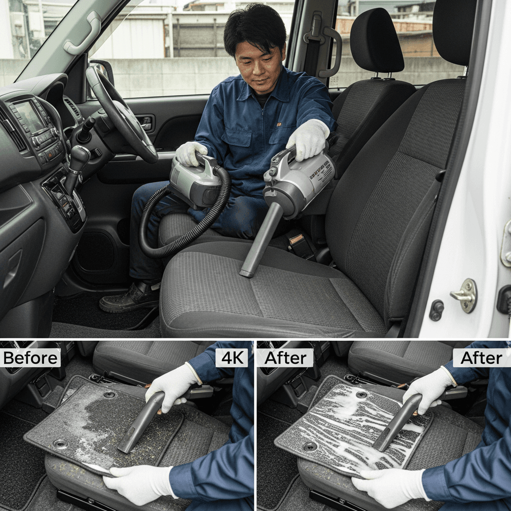 バネオは第一印象が査定の8割を決めます。シート隙間のゴミ除去、マット洗浄、樹脂パーツ艶出しで新車級の清潔感に。特に臭いゼロなら「禁煙車」扱いで+5~8万円UP。