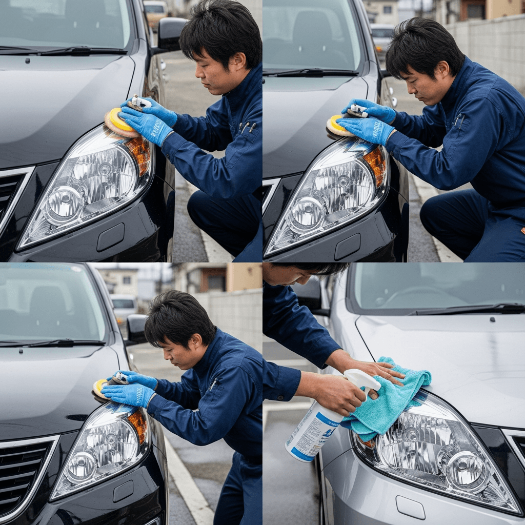 ヴァンガードはヘッドライトの黄ばみとボディの鉄粉が第一印象を損ねます。研磨+鉄粉除去クリーナー+ワックスで輝きを取り戻せば「程度良好」と判断され+4~7万円の効果。