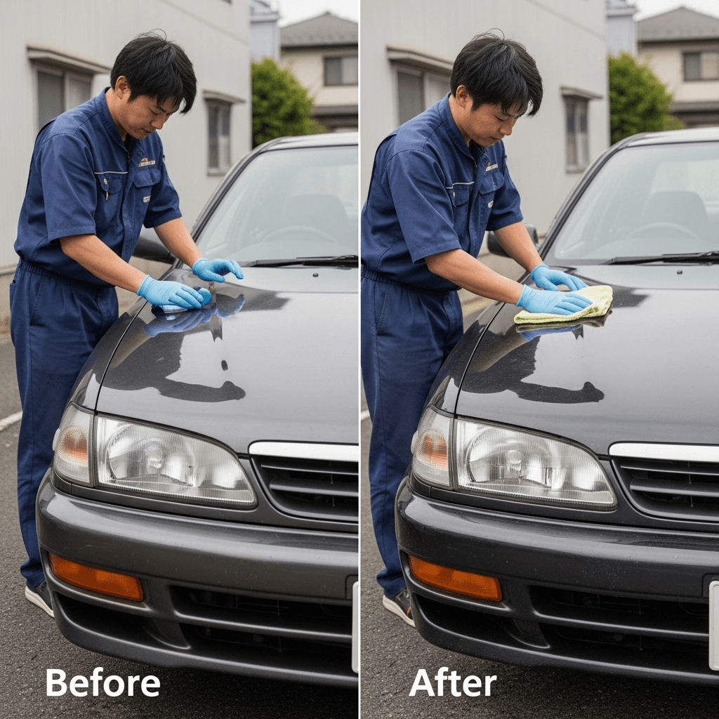 ヴェロッサはヘッドライトの黄ばみとボディの鉄粉が第一印象を損ねます。研磨+鉄粉除去クリーナー+ワックスで輝きを取り戻せば「程度良好」と判断され+4~7万円の効果。