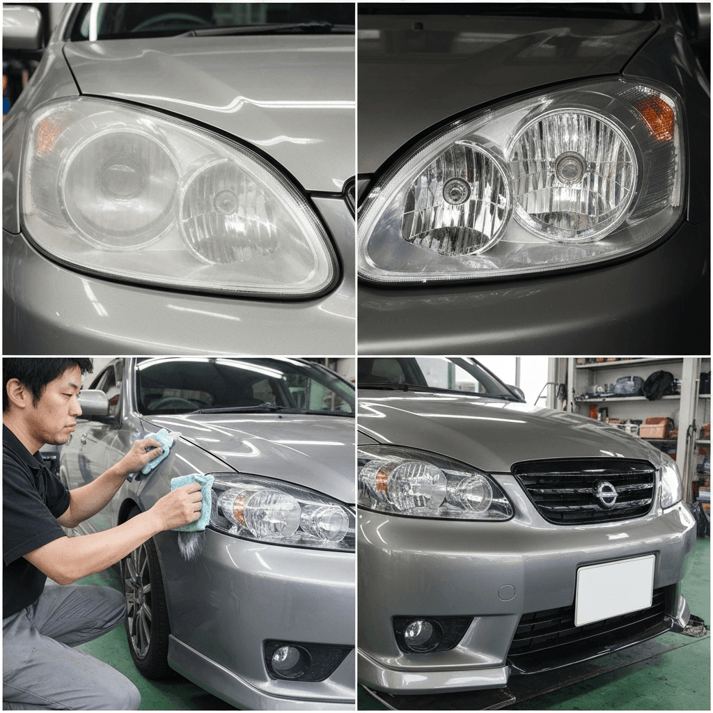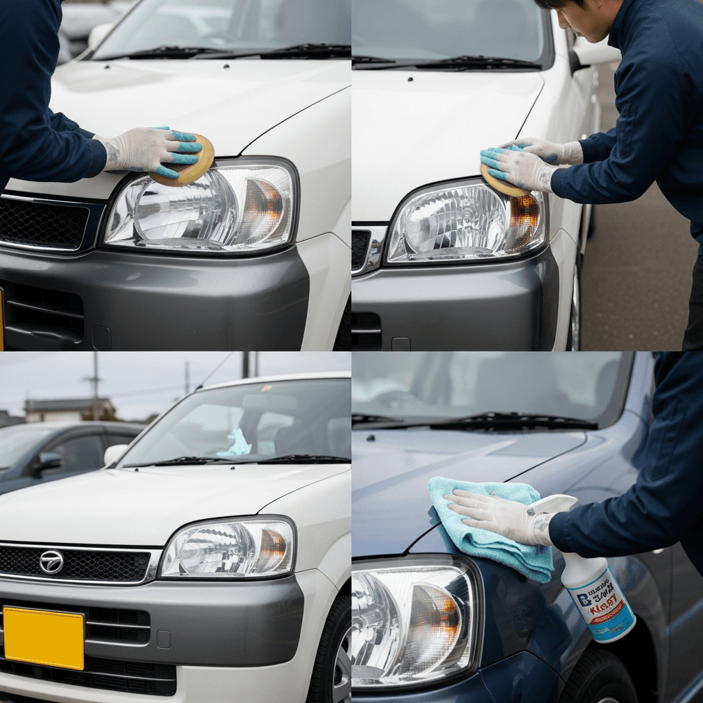 ビュートなでしこはヘッドライトの黄ばみとボディの鉄粉が第一印象を損ねます。研磨+鉄粉除去クリーナー+ワックスで輝きを取り戻せば「程度良好」と判断され+4~7万円の効果。