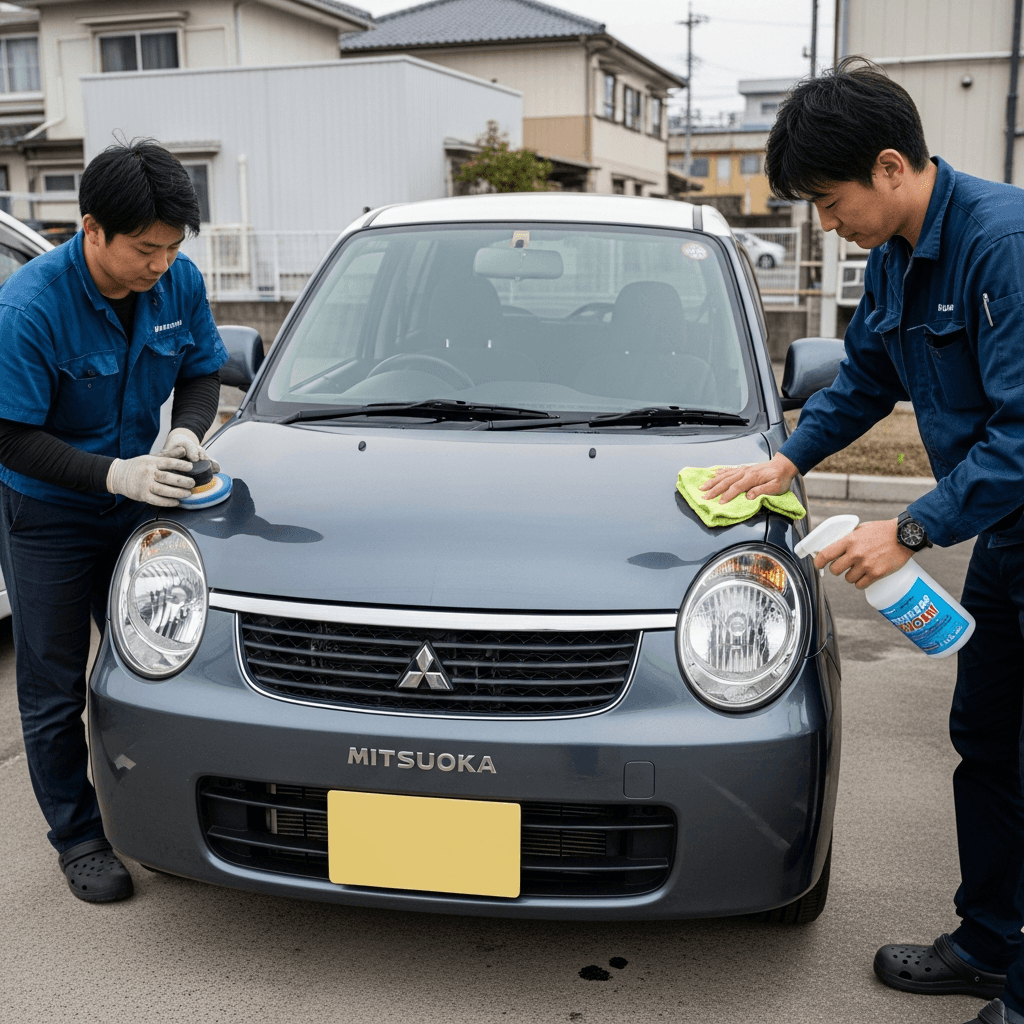 ビュートストーリーはヘッドライトの黄ばみとボディの鉄粉が第一印象を損ねます。研磨+鉄粉除去クリーナー+ワックスで輝きを取り戻せば「程度良好」と判断され+4~7万円の効果。
