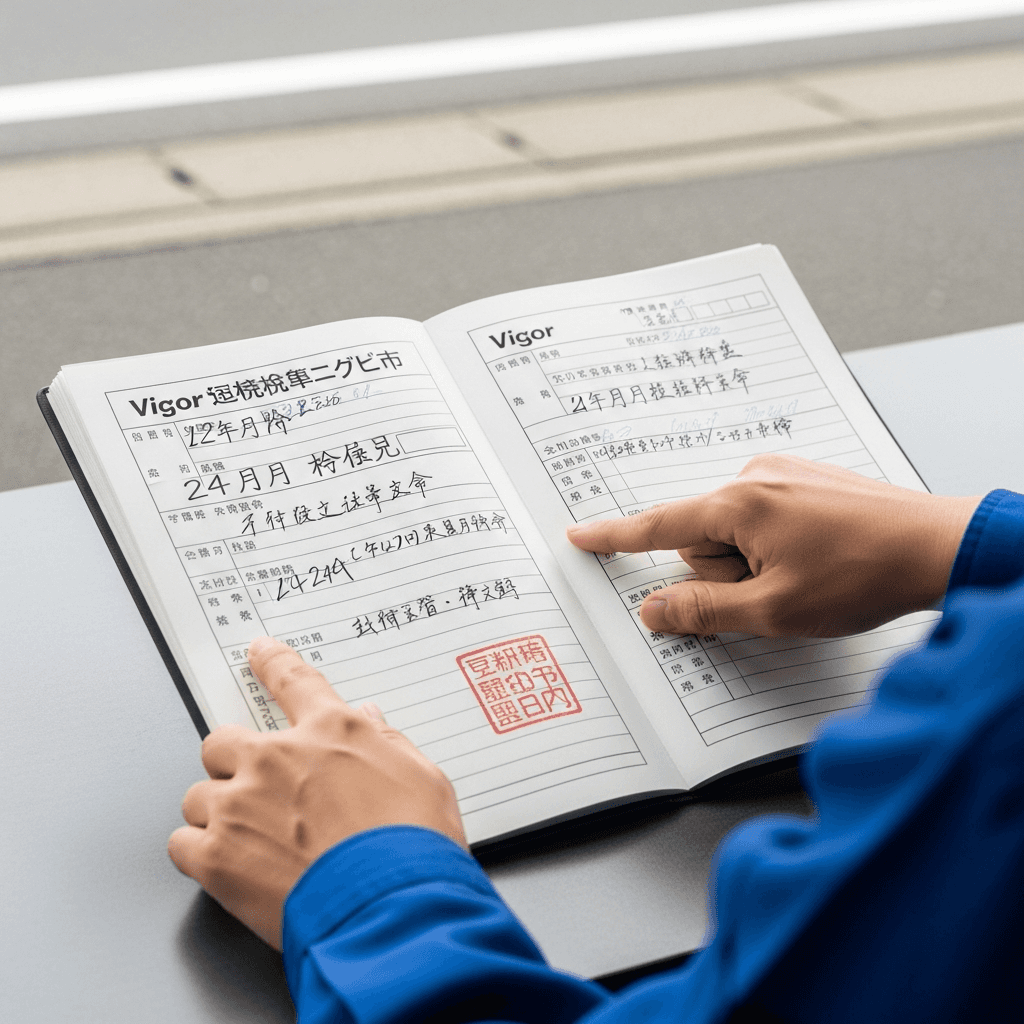 ビガーの整備記録簿に定期点検(12ヶ月・24ヶ月)の履歴が全て記載されていれば「管理の行き届いた車」と高評価。特にエンジンオイル交換履歴は重要で+6~9万円の効果。