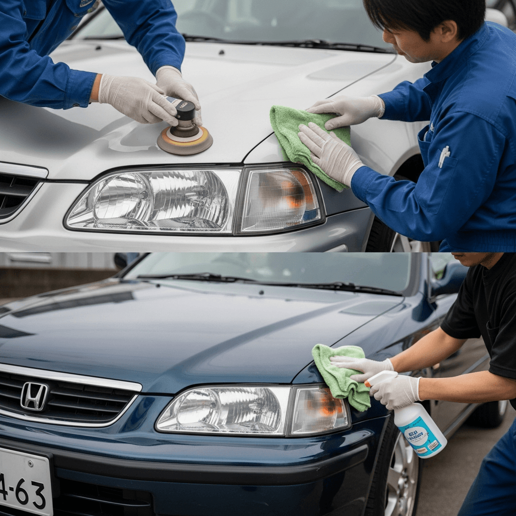 ヘッドライト黄ばみ除去+ボディ鉄粉除去で輝き復活!