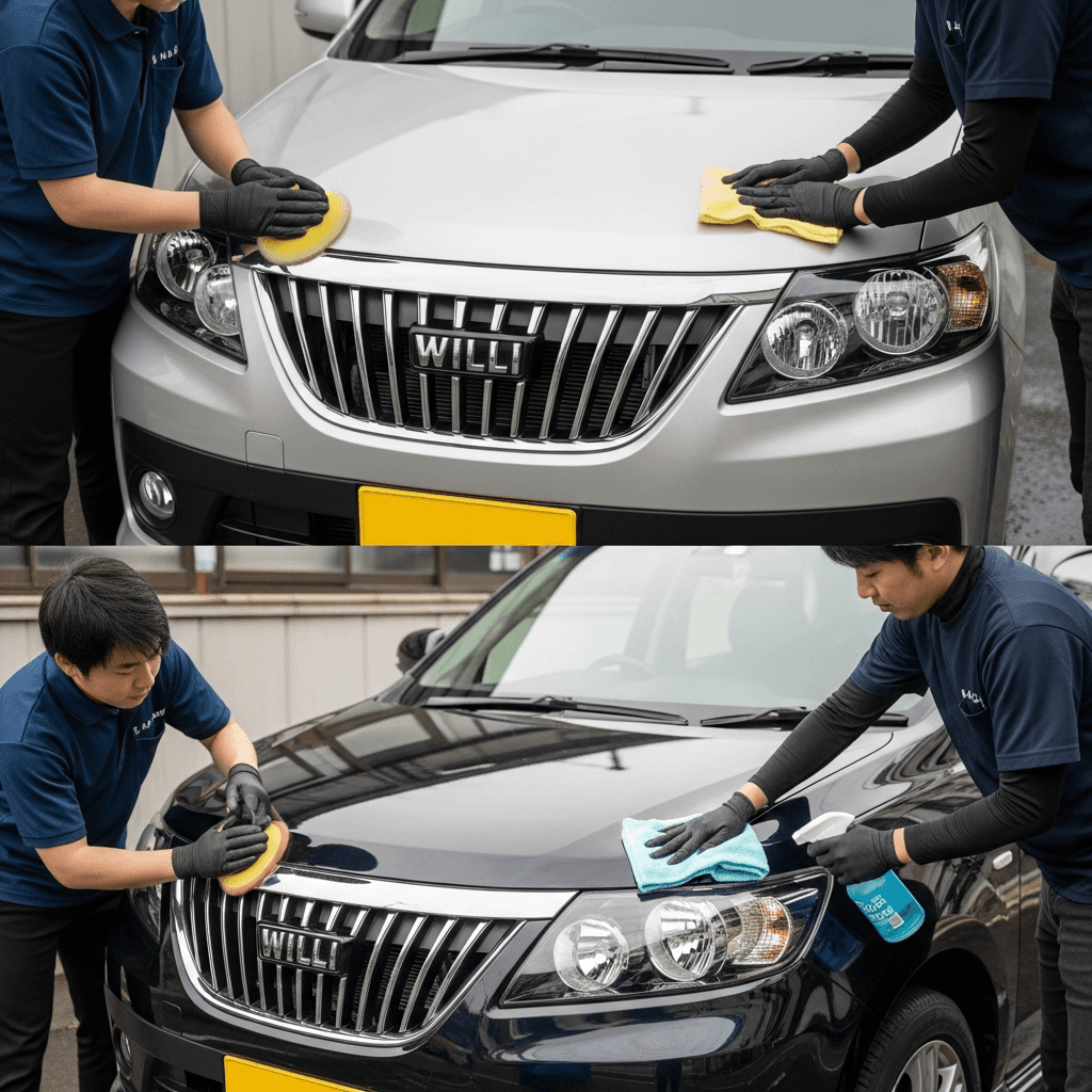 WiLL VSはヘッドライトの黄ばみとボディの鉄粉が第一印象を損ねます。研磨+鉄粉除去クリーナー+ワックスで輝きを取り戻せば「程度良好」と判断され+4~7万円の効果。
