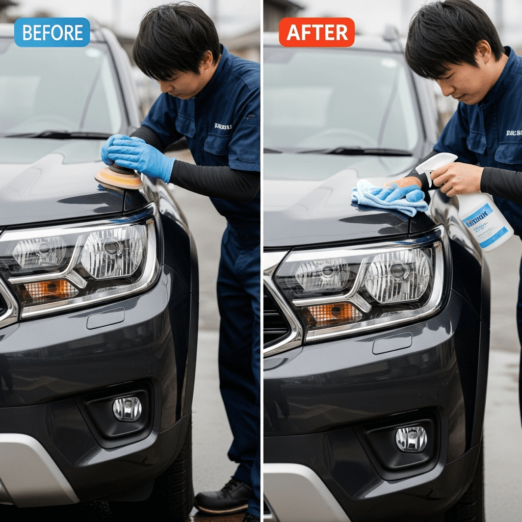 ヘッドライト黄ばみ除去+ボディ鉄粉除去で輝き復活!