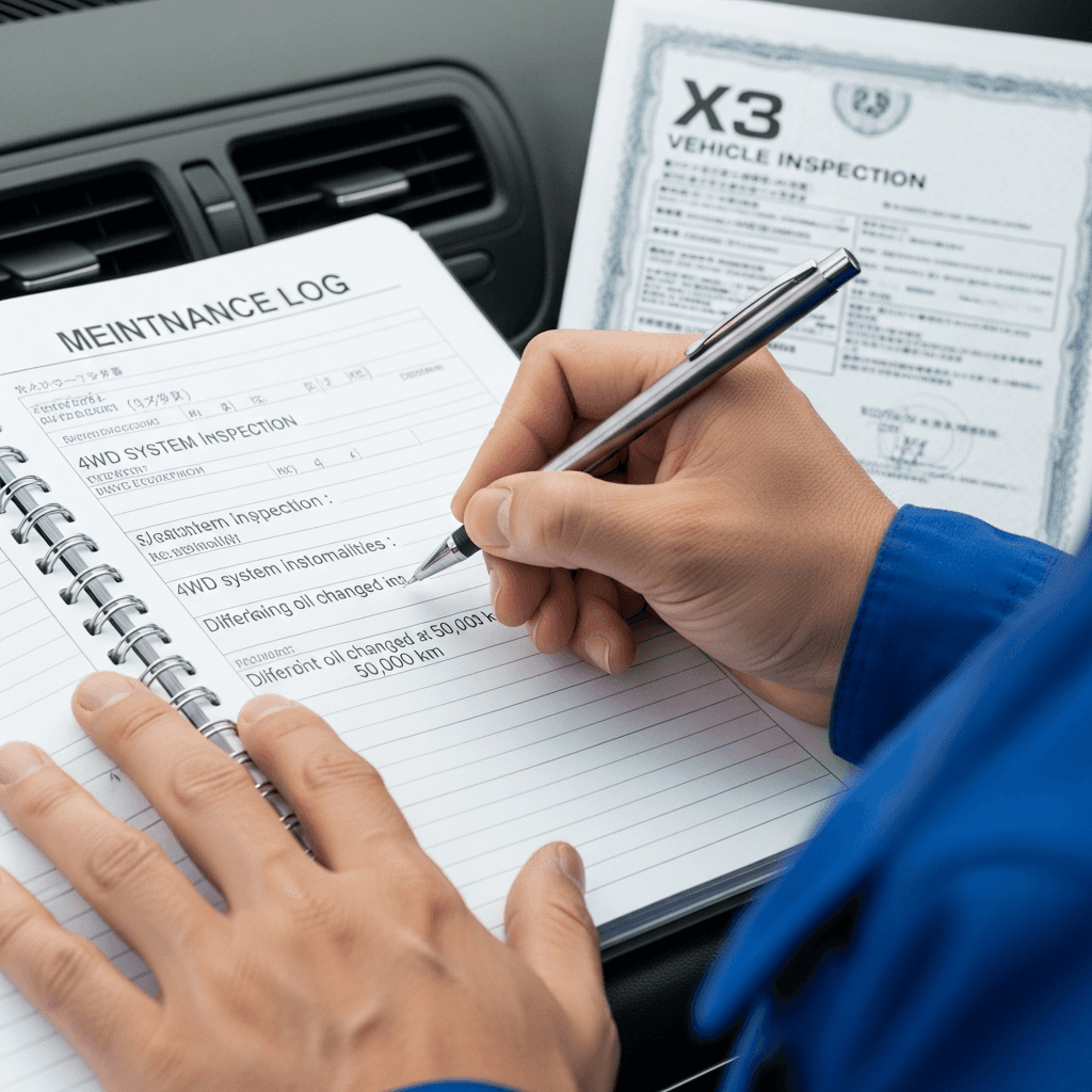 X3のようなSUVは4WD性能が価値の源泉。4WDシステム点検とデフオイル交換記録があれば「オフロード性能維持」と高評価され、+8~12万円の査定UPが期待できます。