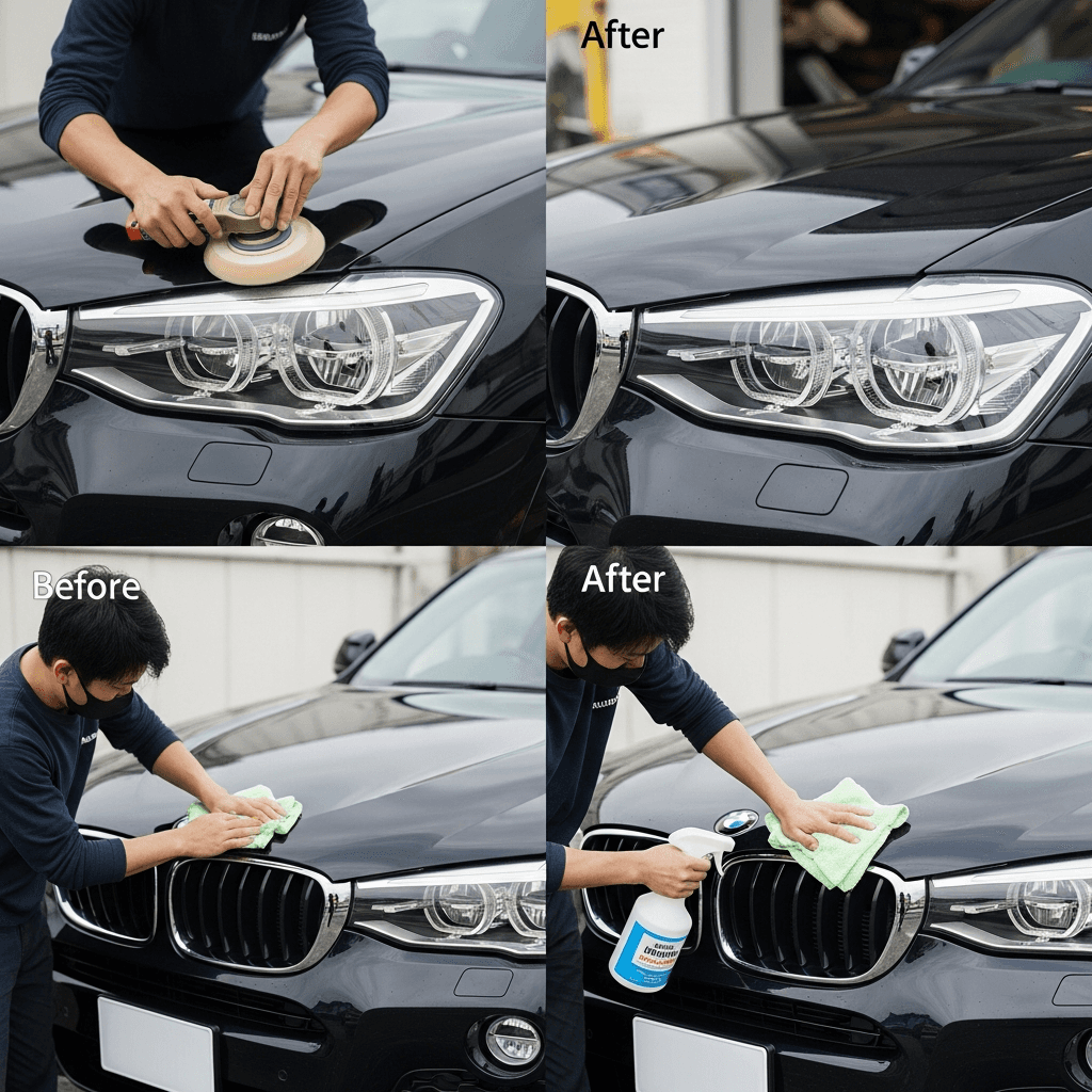 X4はヘッドライトの黄ばみとボディの鉄粉が第一印象を損ねます。研磨+鉄粉除去クリーナー+ワックスで輝きを取り戻せば「程度良好」と判断され+4~7万円の効果。
