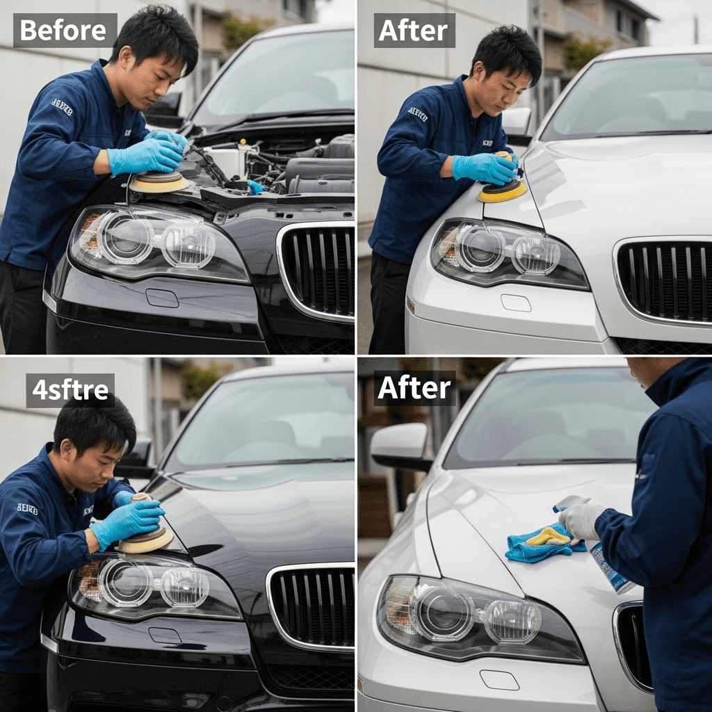 X6はヘッドライトの黄ばみとボディの鉄粉が第一印象を損ねます。研磨+鉄粉除去クリーナー+ワックスで輝きを取り戻せば「程度良好」と判断され+4~7万円の効果。