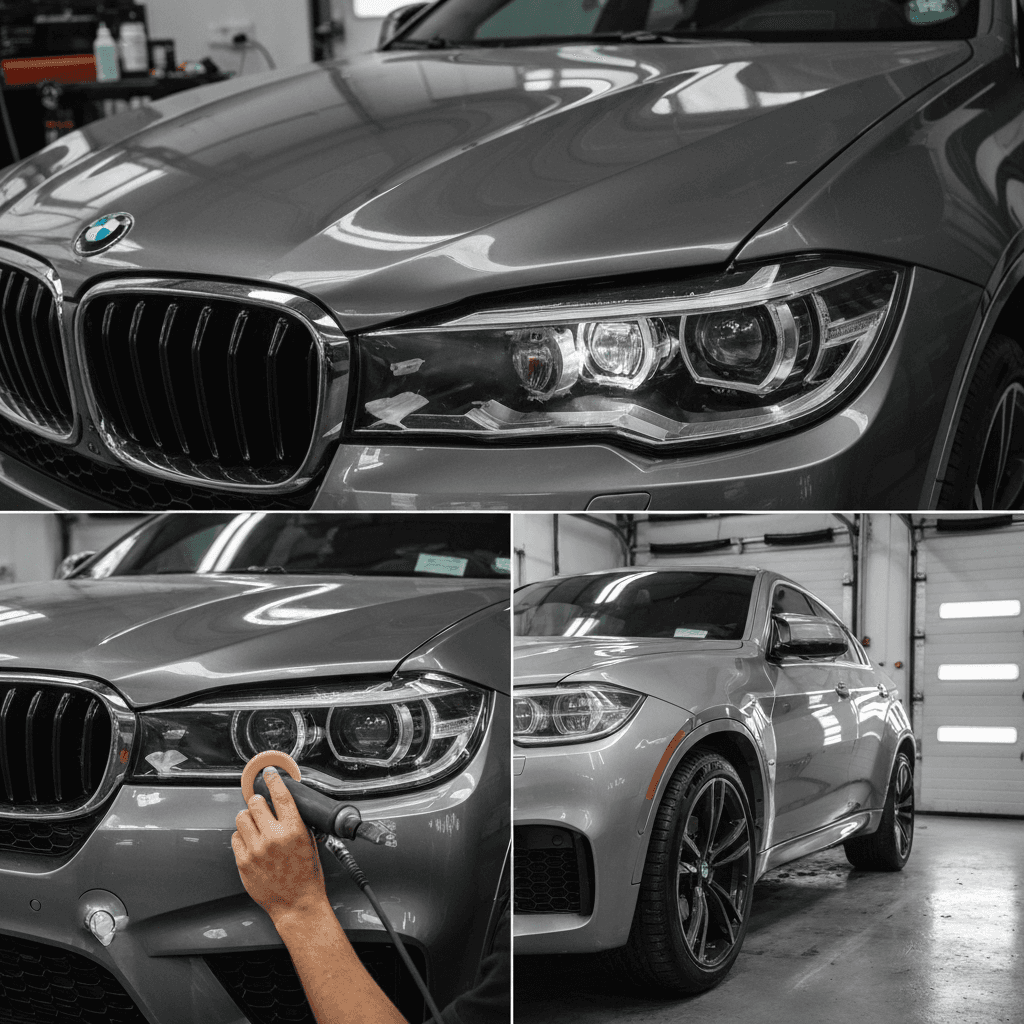 X6 Mはヘッドライトの黄ばみとボディの鉄粉が第一印象を損ねます。研磨+鉄粉除去クリーナー+ワックスで輝きを取り戻せば「程度良好」と判断され+4~7万円の効果。