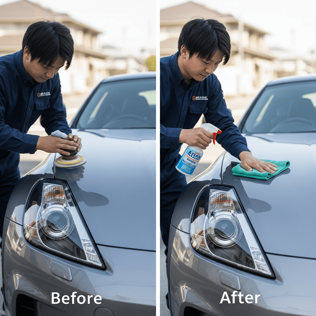 Zはヘッドライトの黄ばみとボディの鉄粉が第一印象を損ねます。研磨+鉄粉除去クリーナー+ワックスで輝きを取り戻せば「程度良好」と判断され+4~7万円の効果。