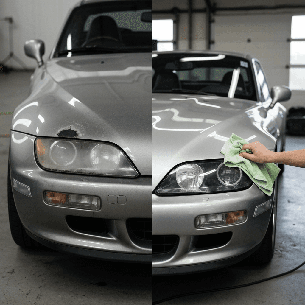 Z3クーペはヘッドライトの黄ばみとボディの鉄粉が第一印象を損ねます。研磨+鉄粉除去クリーナー+ワックスで輝きを取り戻せば「程度良好」と判断され+4~7万円の効果。