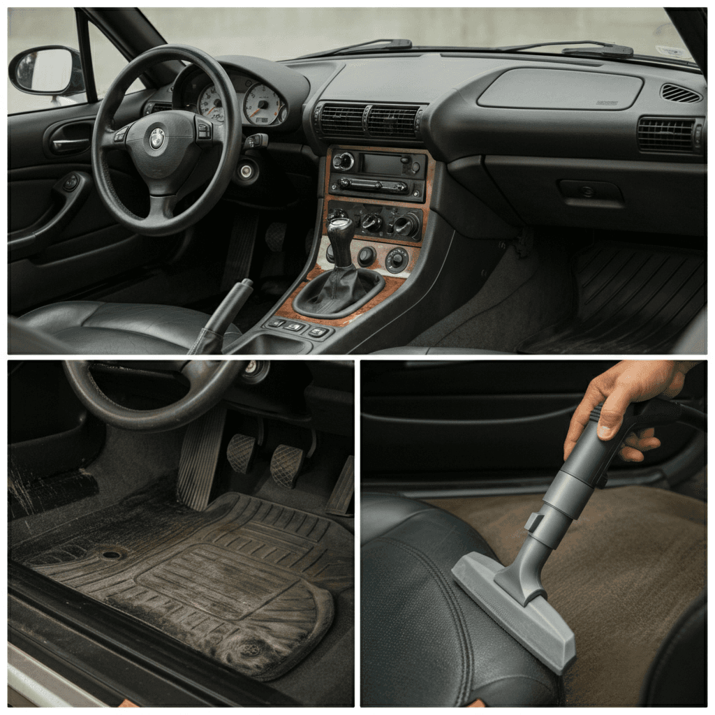 Z3クーペは第一印象が査定の8割を決めます。シート隙間のゴミ除去、マット洗浄、樹脂パーツ艶出しで新車級の清潔感に。特に臭いゼロなら「禁煙車」扱いで+5~8万円UP。