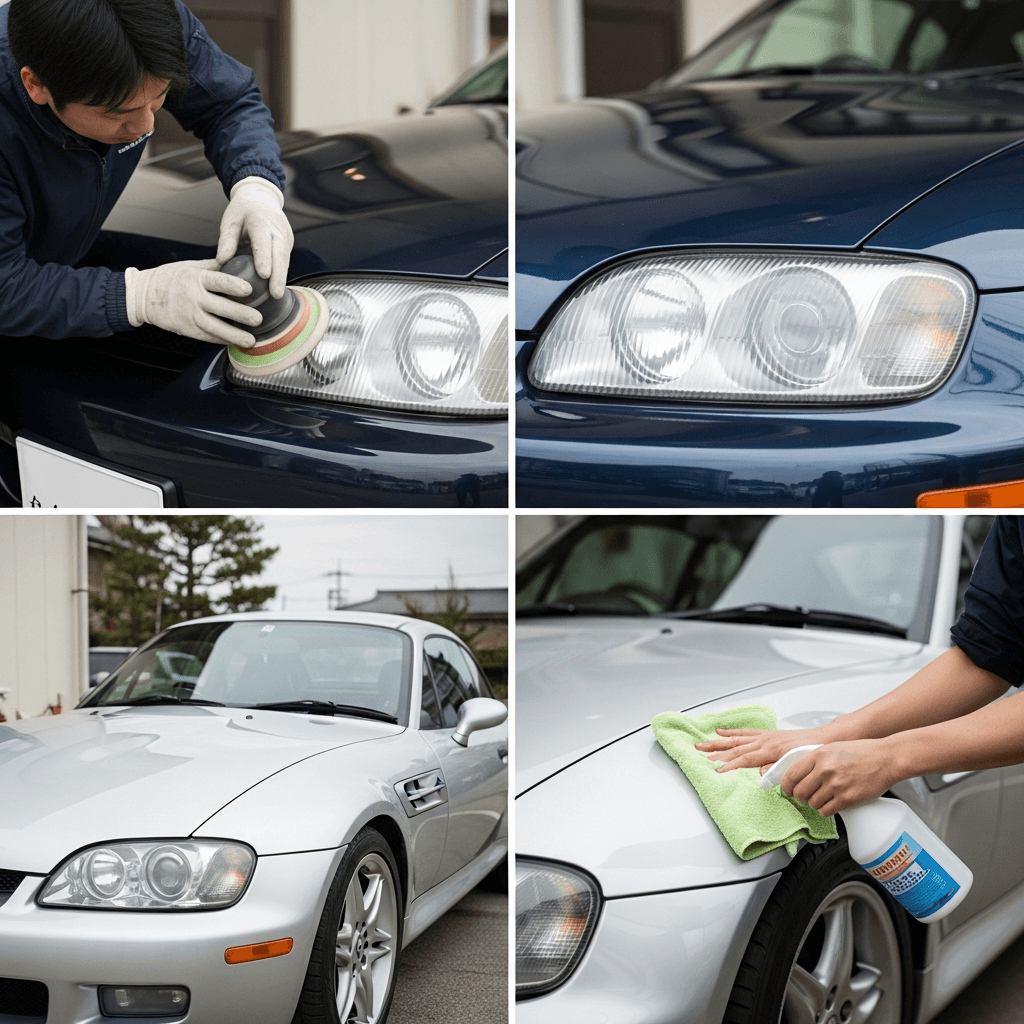 Z3 Mクーペはヘッドライトの黄ばみとボディの鉄粉が第一印象を損ねます。研磨+鉄粉除去クリーナー+ワックスで輝きを取り戻せば「程度良好」と判断され+4~7万円の効果。
