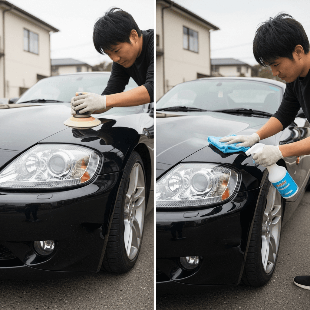 Z4クーペはヘッドライトの黄ばみとボディの鉄粉が第一印象を損ねます。研磨+鉄粉除去クリーナー+ワックスで輝きを取り戻せば「程度良好」と判断され+4~7万円の効果。