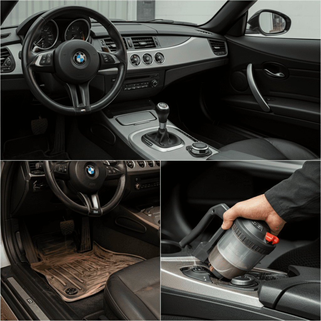 Z4クーペは第一印象が査定の8割を決めます。シート隙間のゴミ除去、マット洗浄、樹脂パーツ艶出しで新車級の清潔感に。特に臭いゼロなら「禁煙車」扱いで+5~8万円UP。