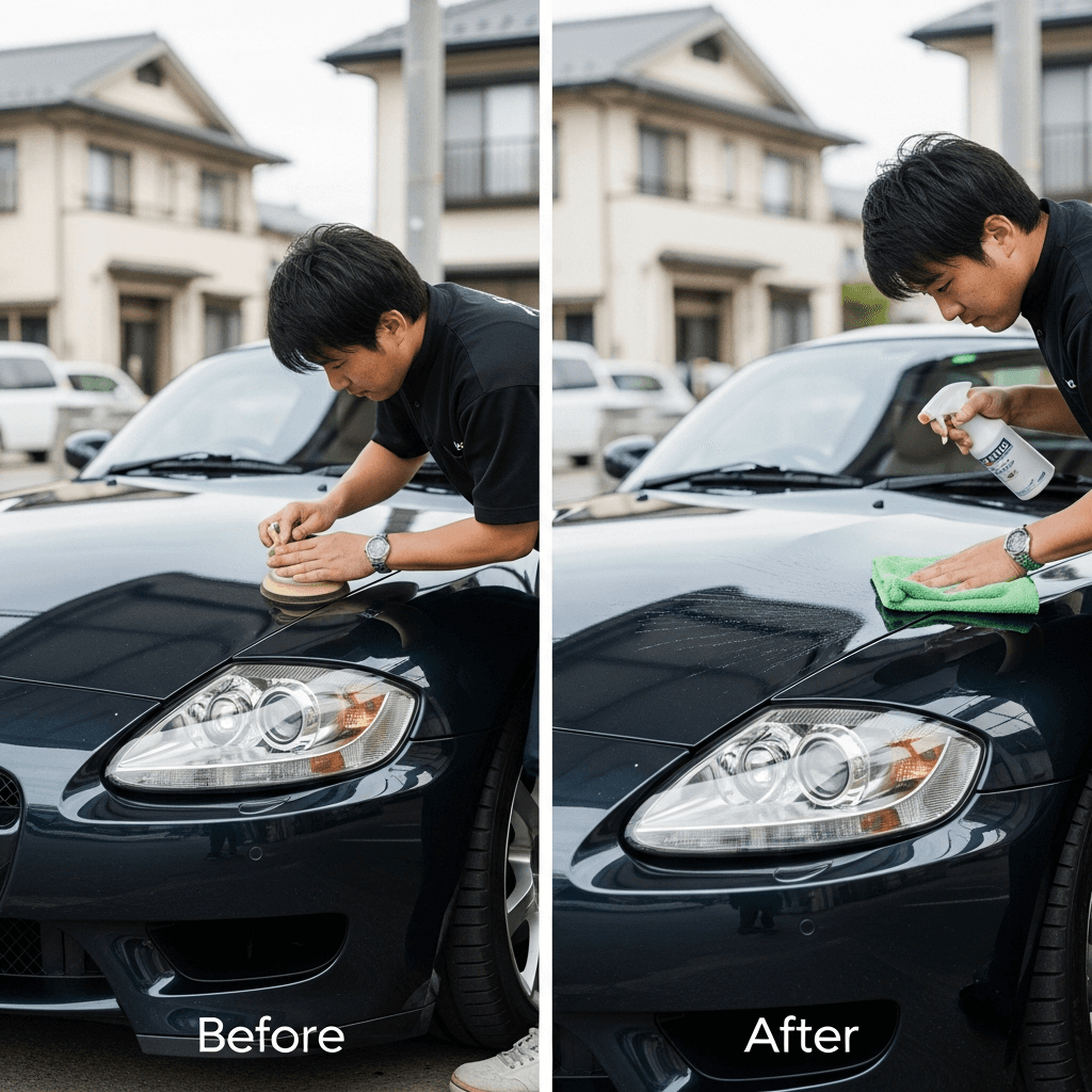 Z4 Mクーペはヘッドライトの黄ばみとボディの鉄粉が第一印象を損ねます。研磨+鉄粉除去クリーナー+ワックスで輝きを取り戻せば「程度良好」と判断され+4~7万円の効果。