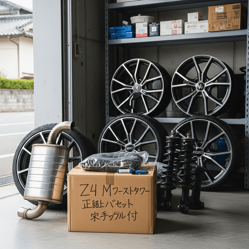 Z4 Mロードスターはカスタム車両が多いですが、純正マフラー・サスペンション・ホイールが保管されていれば査定額は下がりません。「純正戻し可能」をアピールすることで+7~10万円の価値創出。