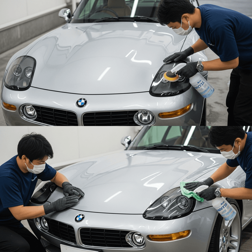 Z8はヘッドライトの黄ばみとボディの鉄粉が第一印象を損ねます。研磨+鉄粉除去クリーナー+ワックスで輝きを取り戻せば「程度良好」と判断され+4~7万円の効果。