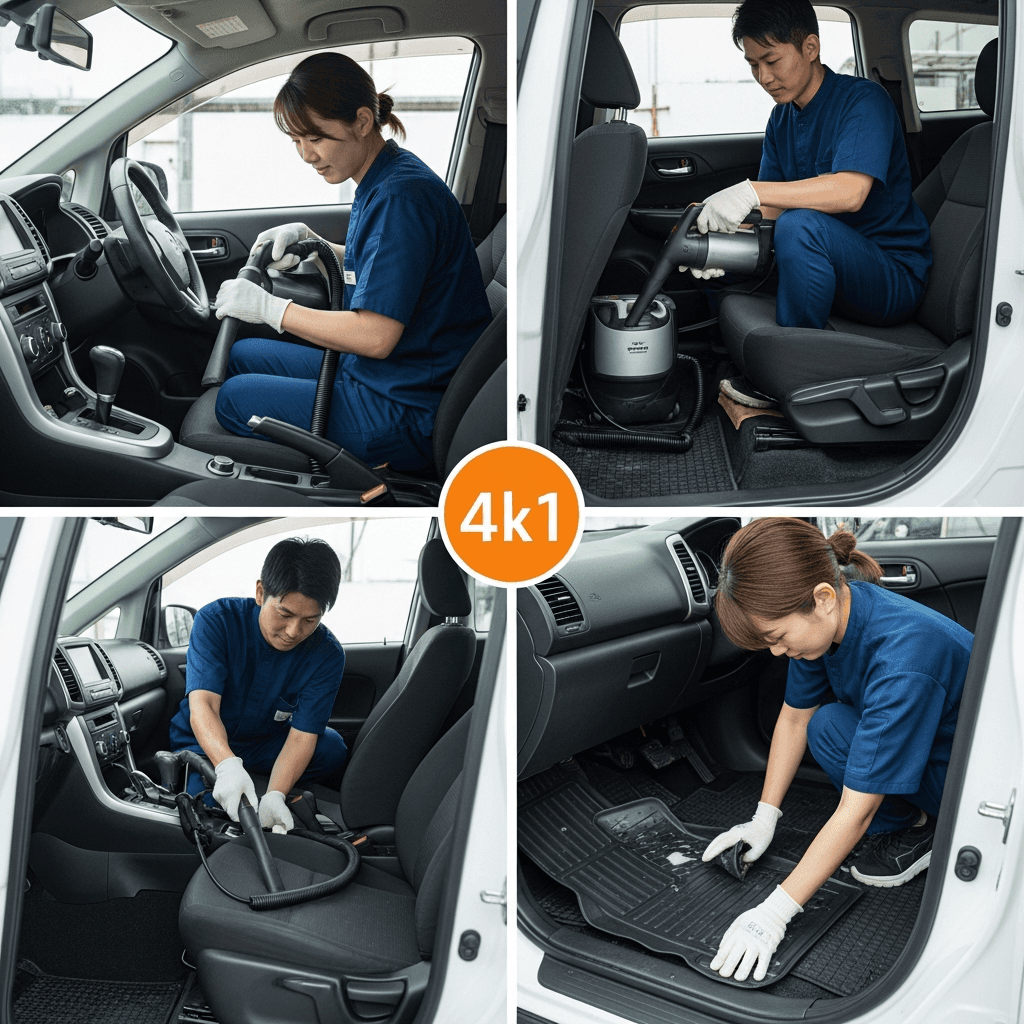 ゼロ1は第一印象が査定の8割を決めます。シート隙間のゴミ除去、マット洗浄、樹脂パーツ艶出しで新車級の清潔感に。特に臭いゼロなら「禁煙車」扱いで+5~8万円UP。