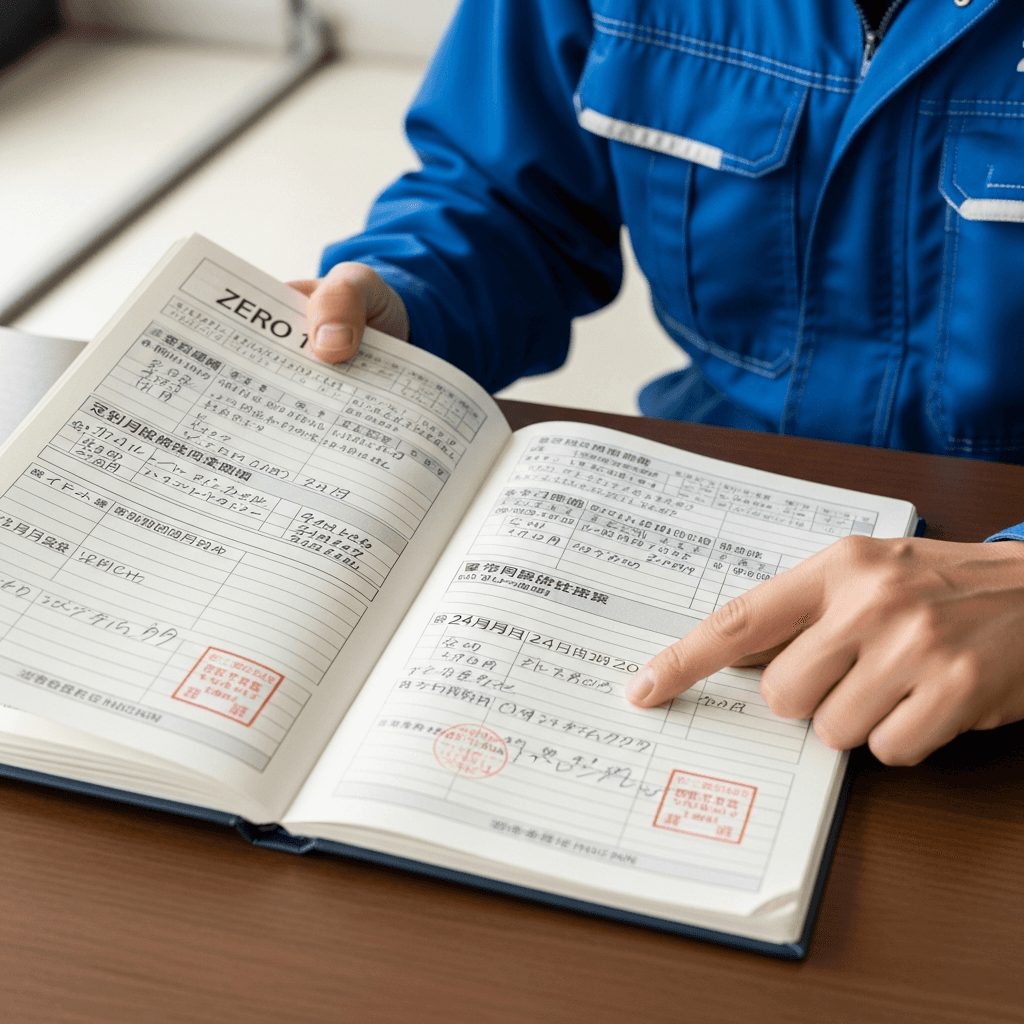ゼロ1の整備記録簿に定期点検(12ヶ月・24ヶ月)の履歴が全て記載されていれば「管理の行き届いた車」と高評価。特にエンジンオイル交換履歴は重要で+6~9万円の効果。